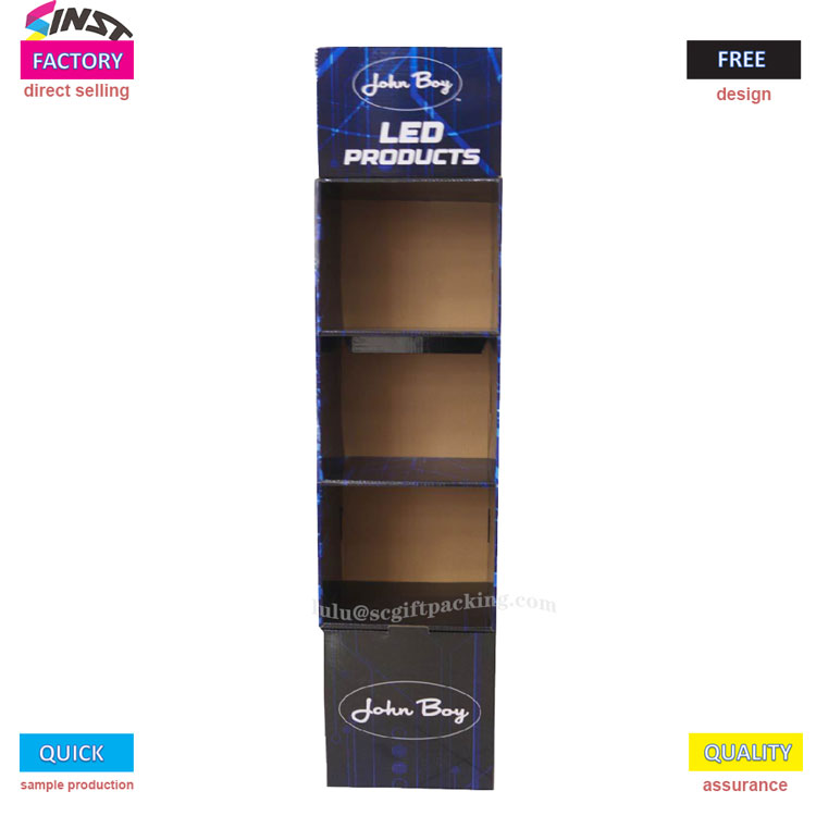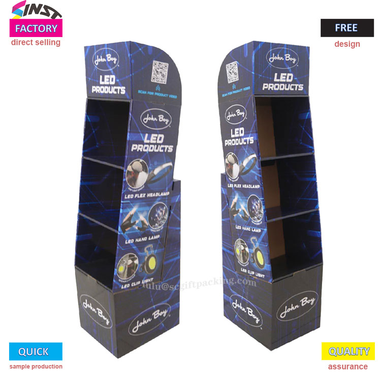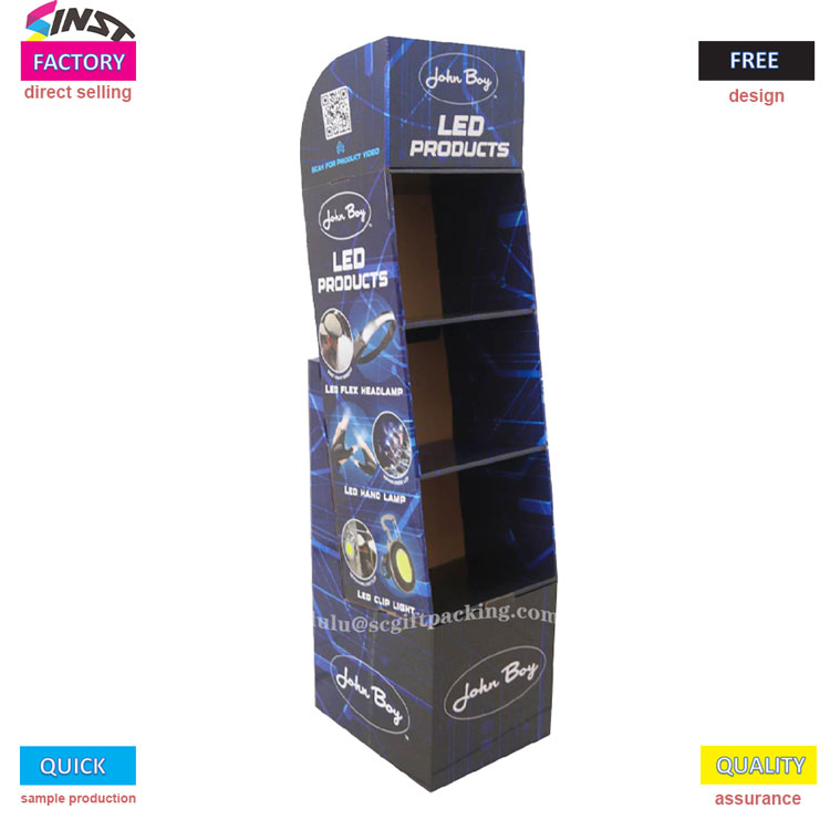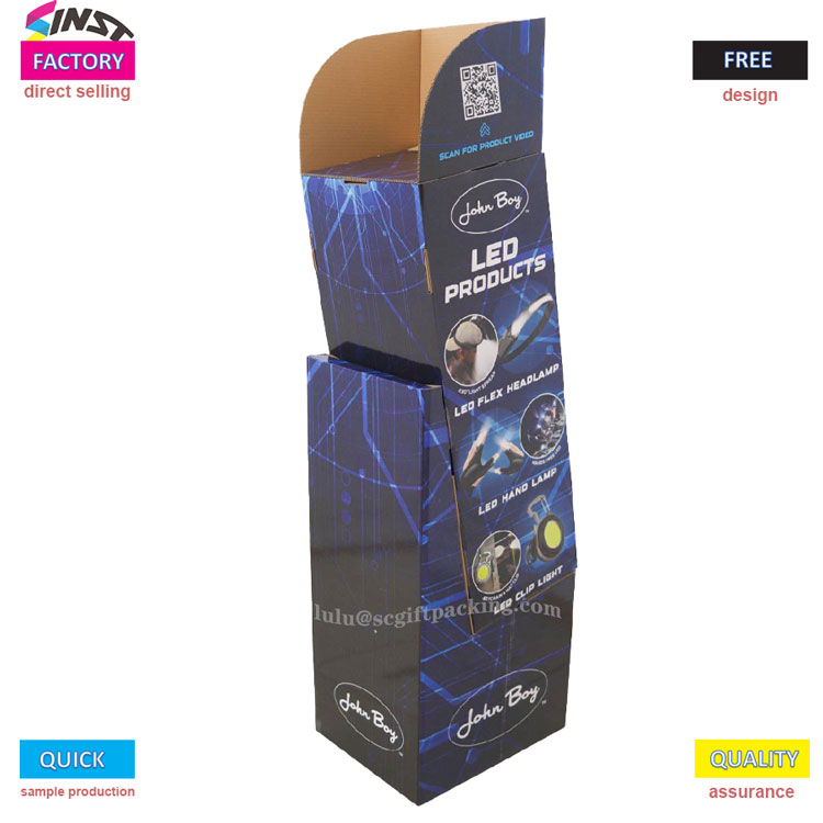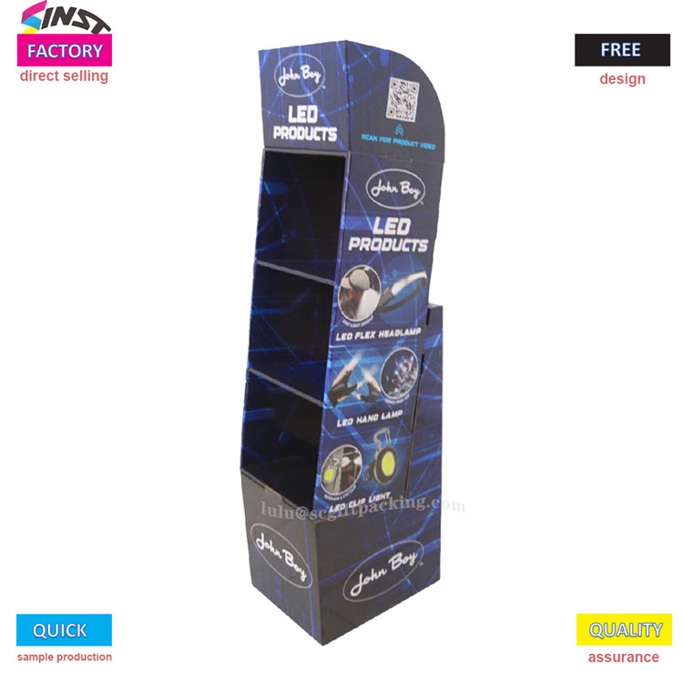 এলইডি পণ্য rug েউখেলান কার্ডবোর্ড ডিসপ্লে র্যাকটি বিশেষভাবে ছোট আকার এবং বিভিন্ন ধরণের পণ্য সহ এলইডি লাইটিং ফিক্সচারগুলির জন্য ডিজাইন করা হয়েছে। এটি নীল রেখাগুলির সাথে একটি গভীর নীল এবং কালো রঙের স্কিম বৈশিষ্ট্যযুক্ত, প্রযুক্তি এবং সরলতার সংমিশ্রণে; প্রতিটি স্তর সমতল পদ্ধতিতে এলইডি হেডলাইট, এলইডি ফ্ল্যাশলাইট, এলইডি ক্লিপ লাইট ইত্যাদি প্রদর্শন করতে পারে এবং ওপেন ডিজাইনে পণ্যগুলি বাধা ছাড়াই প্রদর্শিত হতে দেয়, সুপারমার্কেট আলোর "দৃশ্য ভিত্তিক প্রদর্শন" প্রয়োজনের সাথে খাপ খাইয়ে।