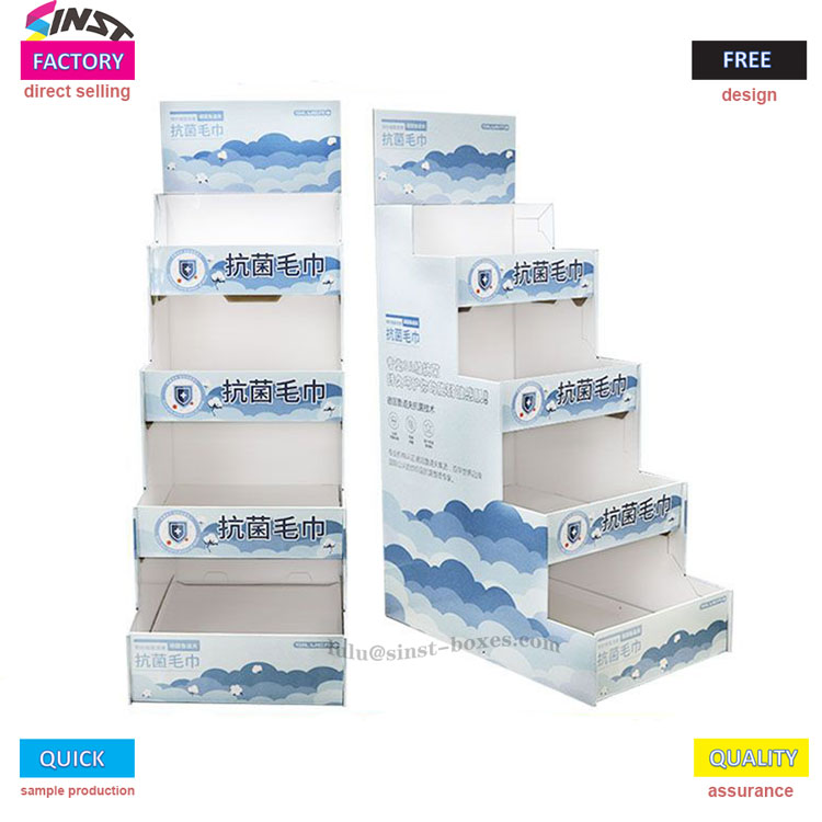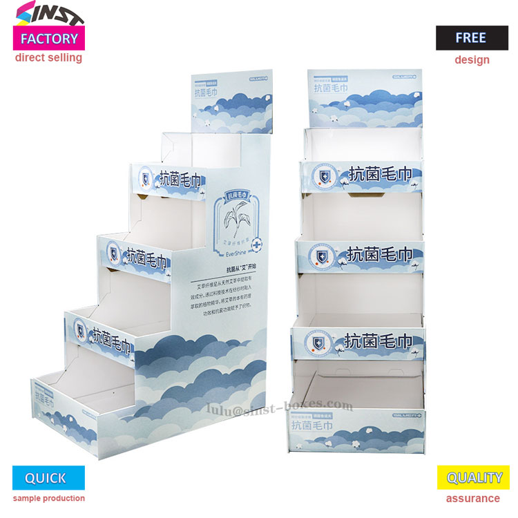 এই পুরু কার্ডবোর্ডের তোয়ালে র্যাকটি সুপারমার্কেট, সুবিধার দোকান এবং সৌন্দর্যের দোকানগুলির মতো দ্রুত-চলমান ভোক্তা পরিস্থিতিগুলির চাহিদা পুরোপুরি পূরণ করে। তোয়ালে ডিসপ্লে র্যাকের ধাপযুক্ত কাঠামো একটি "স্তরযুক্ত স্টোরেজ বক্স" এর মতো, যা সুন্দরভাবে বিভিন্ন স্পেসিফিকেশনের তোয়ালে রাখতে পারে যেমন টিস্যু, বহনযোগ্য আইটেম, মুখের তোয়ালে, ভেজা মোছা ইত্যাদি, যা তাদের পরিষ্কার এবং পুনরুদ্ধার করা সহজ করে তোলে। শীর্ষে থাকা প্রচারমূলক কার্ডটিকে "মা এবং শিশুর স্তরের শংসাপত্র" এবং "নরম এবং নন-শেডিং" এর মতো বৈশিষ্ট্যগুলির সাথে যুক্ত করা যেতে পারে যাতে তোয়ালেগুলিকে শেলফে "নিজের জন্য কথা বলতে" অনুমতি দেওয়া যায়।